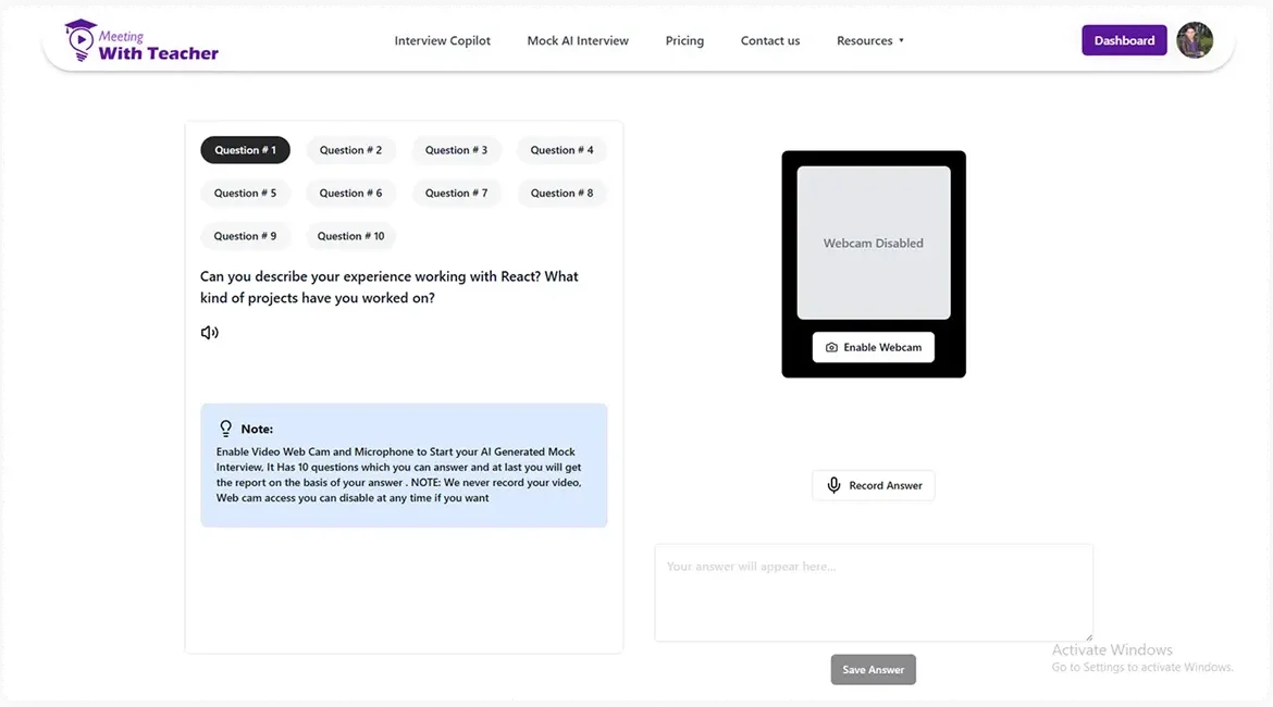Meeting with a Teacher uses advanced speech recognition to listen to interview questions in real time. No need to type or copy questions, the system picks them up instantly as they’re spoken. This makes practice sessions feel natural, just like a real interview.